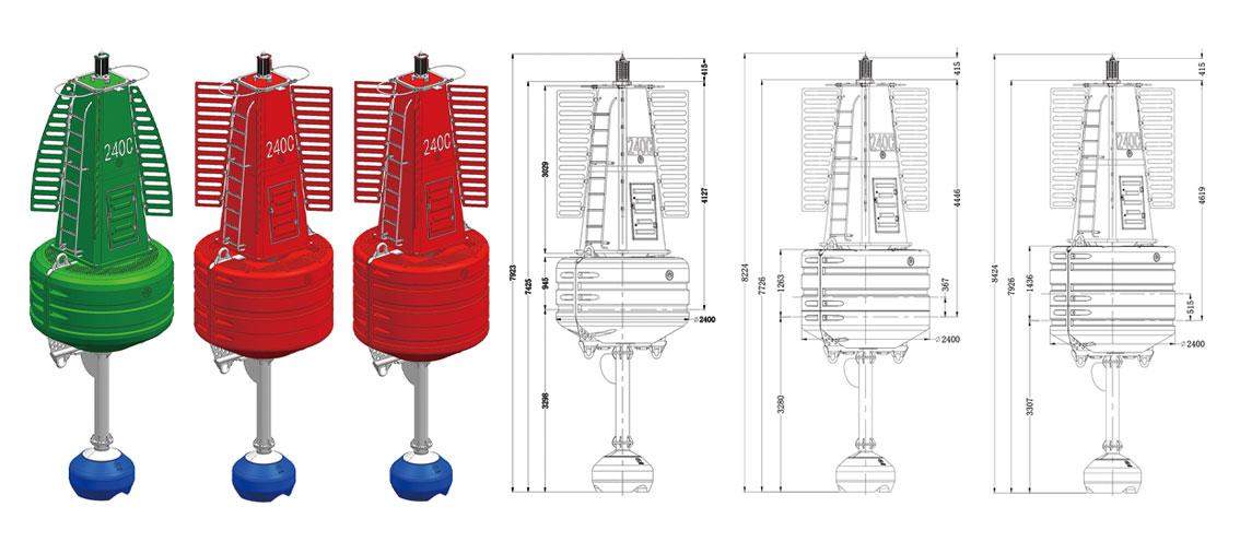 海豹240C型滚塑浮标采用316L不锈钢骨架与滚塑主体模块组合而成,适用于内河及港口的导助航浮标。