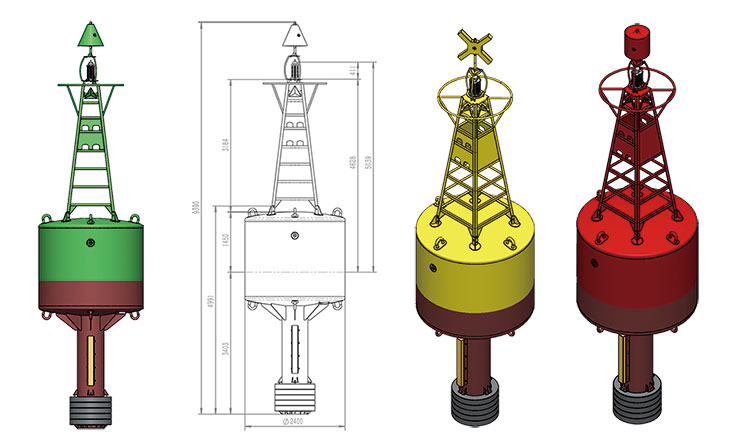 浮标由浮体(隔仓)、尾管、平衡铁和灯架构成。