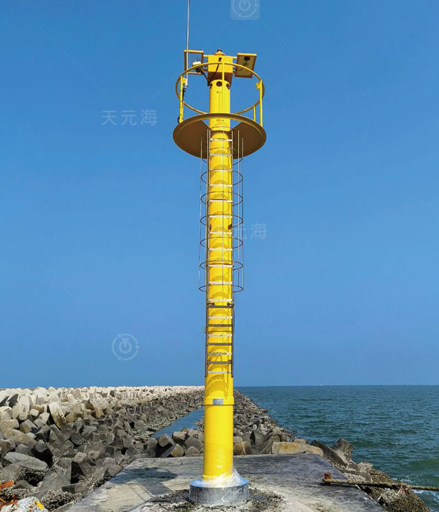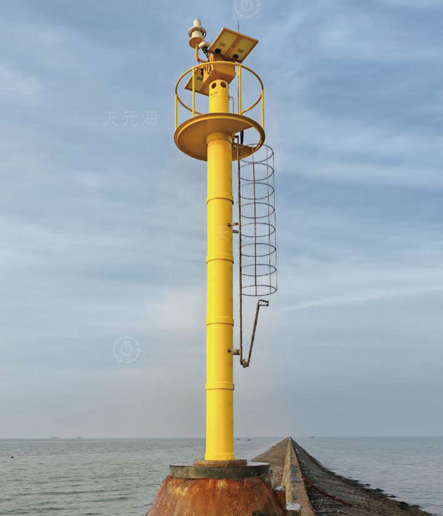 珊瑚系列滚塑灯桩是天元海公司自主研发的新型复合灯桩,由内部高强度钢骨架、外部滚塑筒体、维修平台、高显形护栏、外爬梯、避雷针等部分组成。结构坚固,可抗17级台风,并可承受海浪强烈拍击,广泛用于岛礁、岬角、港口、防波堤等各种恶劣环境。