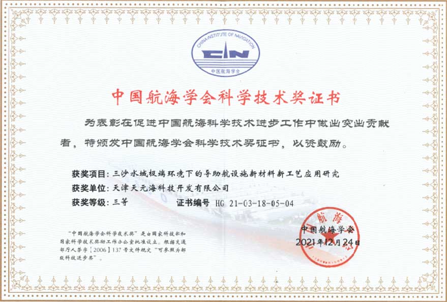 三沙水域极端环境下的导助航设施新材料新工艺应用研究获得中国航海学会科学技术奖三等奖